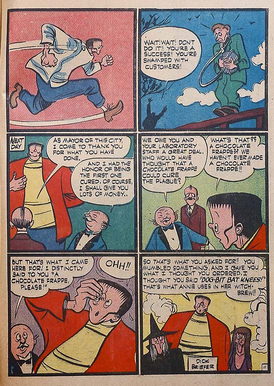 At the end of World War II, writer/artist Dick Briefer took the horror strip Monster of Frankenstein and revamped it into a humor series that predated TV's The Munsters by two decades!