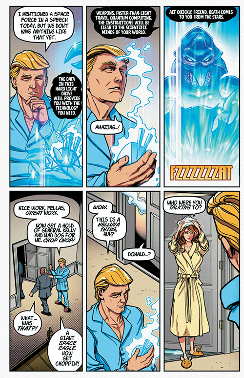 The Celestial Peacekeeping Astral Coalition contacts the President of the United States, Donald Trump, to deliver a dire warning: Earth is in danger of takeover by another group of aliens from somewhere in the far left wing of the galaxy.