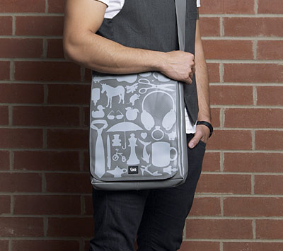Ideas are your bag – so why not carry them in a bag of ideas?With a flap adorned by miscellany in silhouette — ranging from the extraordinary to the everyday — this bag is designed to tote the tools of your craft.Perfect for notebooks or even a 15" laptop – slip it into the bag for quick trips to pitch clients or an impromptu coffee shop stop.Made of durable gray-tone vinyl and lined with neon green fabric. Offered for sale and as a premium for customers buying a volume of images or fonts from 2007-2009.